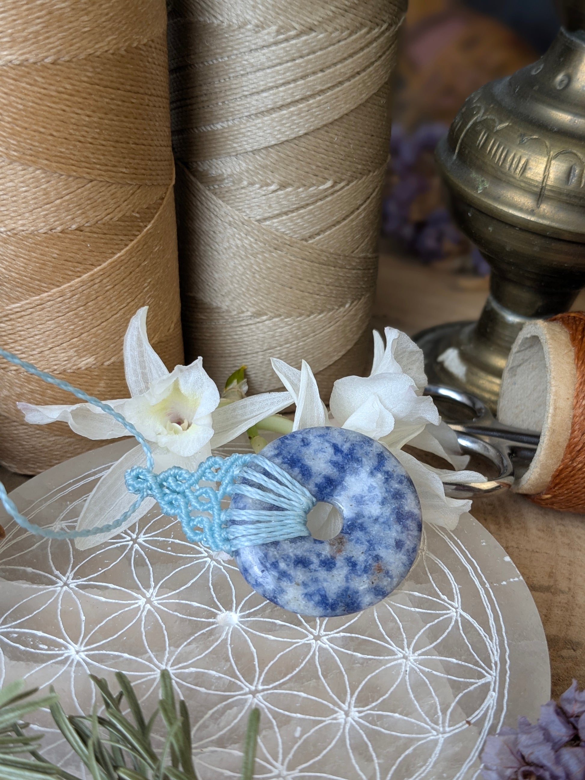 This necklace is woven around a 3 cm diameter Sodalite donut.