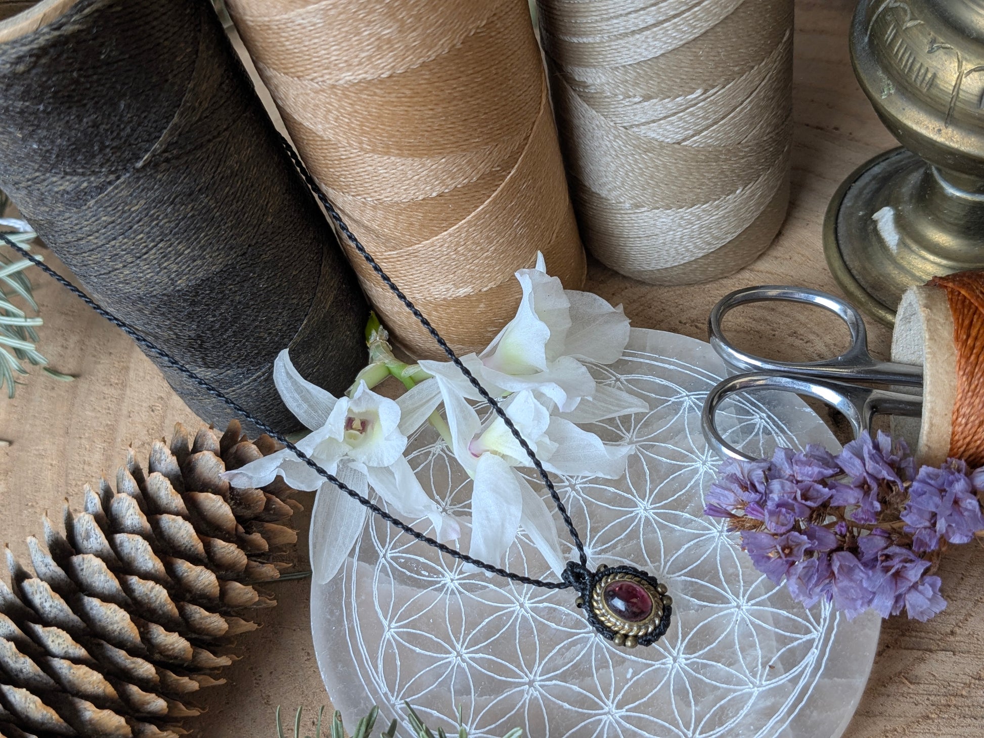 Ce collier est tissé autour d'un Grenat sertie de laiton ouvragé.