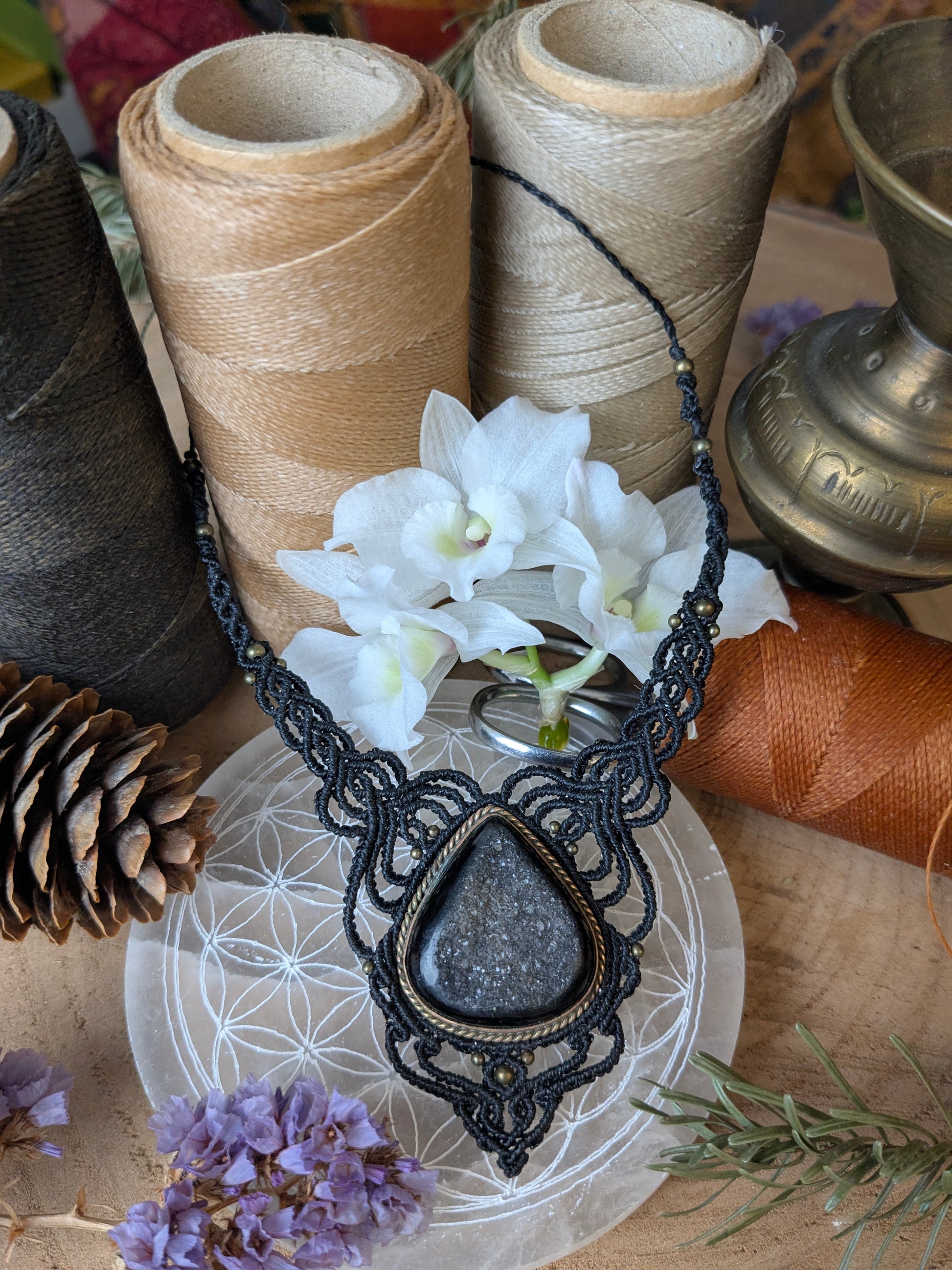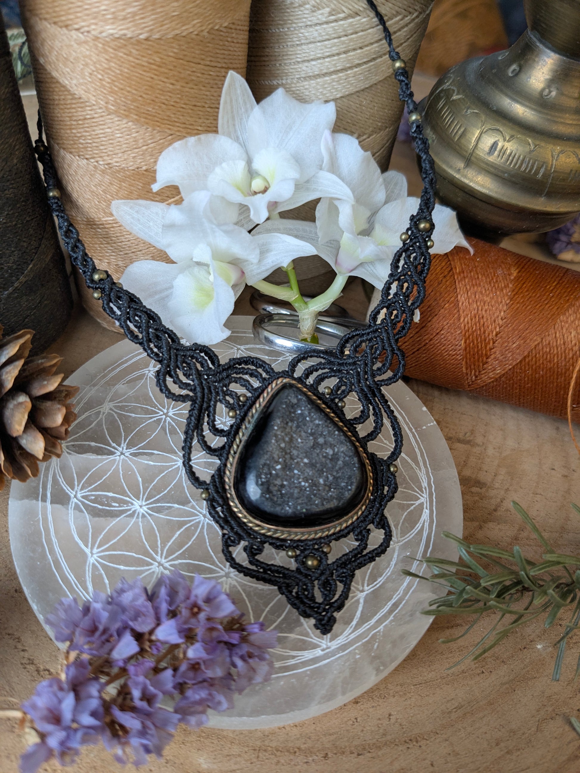 Un coeur de Septaria, sertie de laiton, se pare d'un tissé noir.