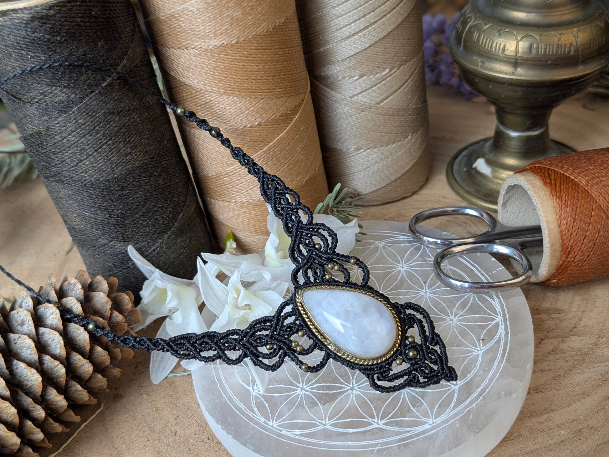 Cette pierre de lune sertie se pare d'un tissé noir.