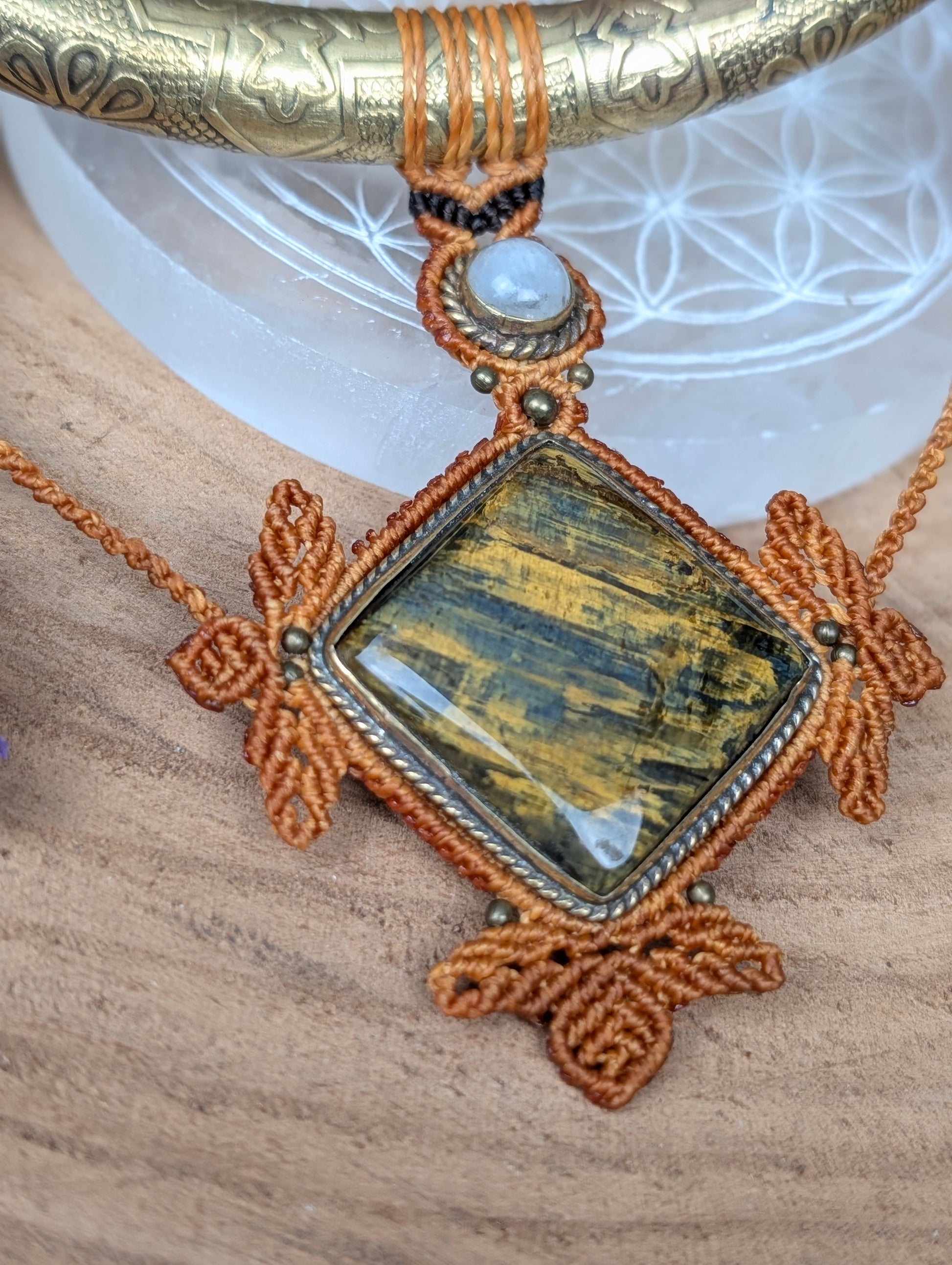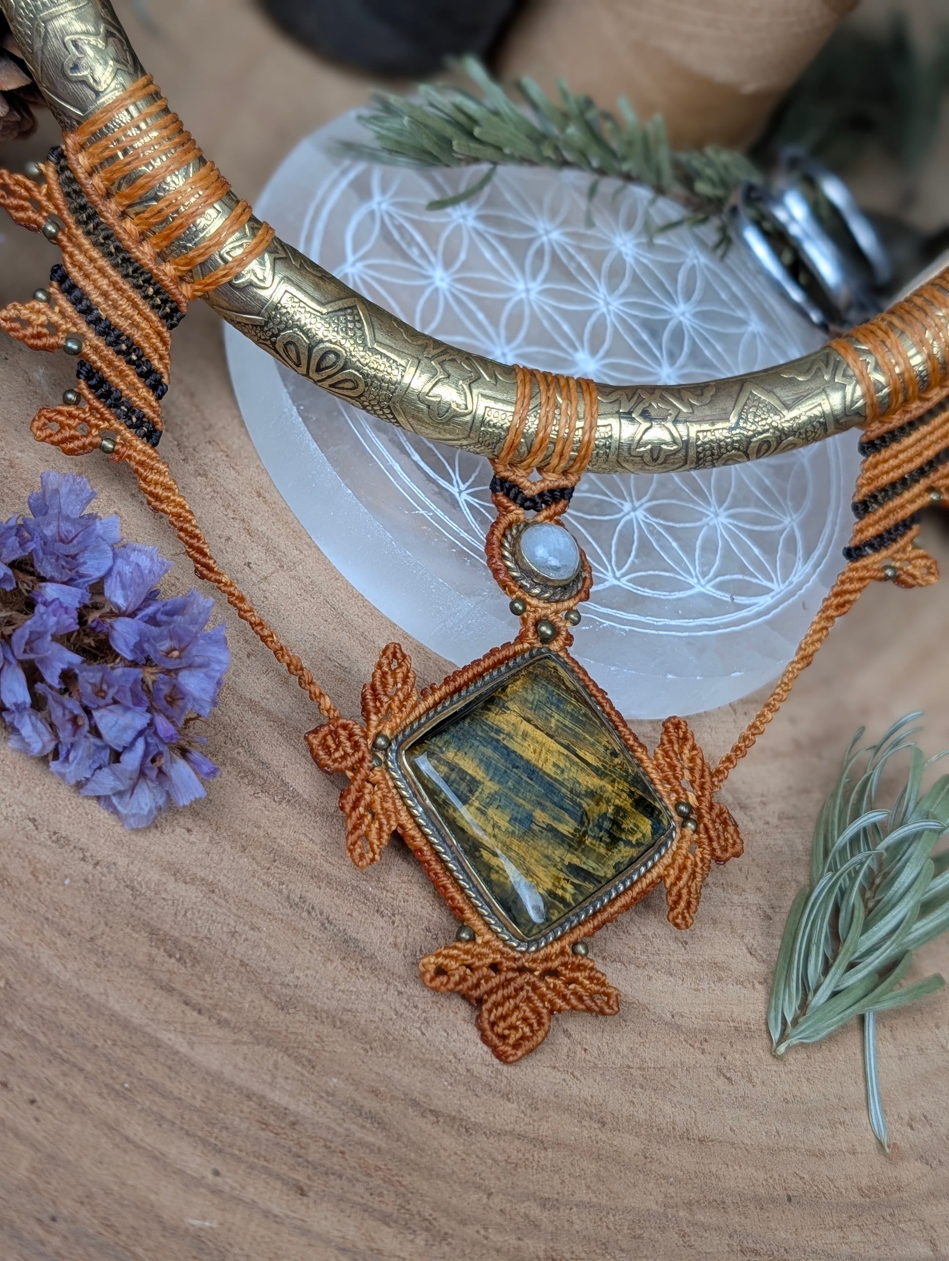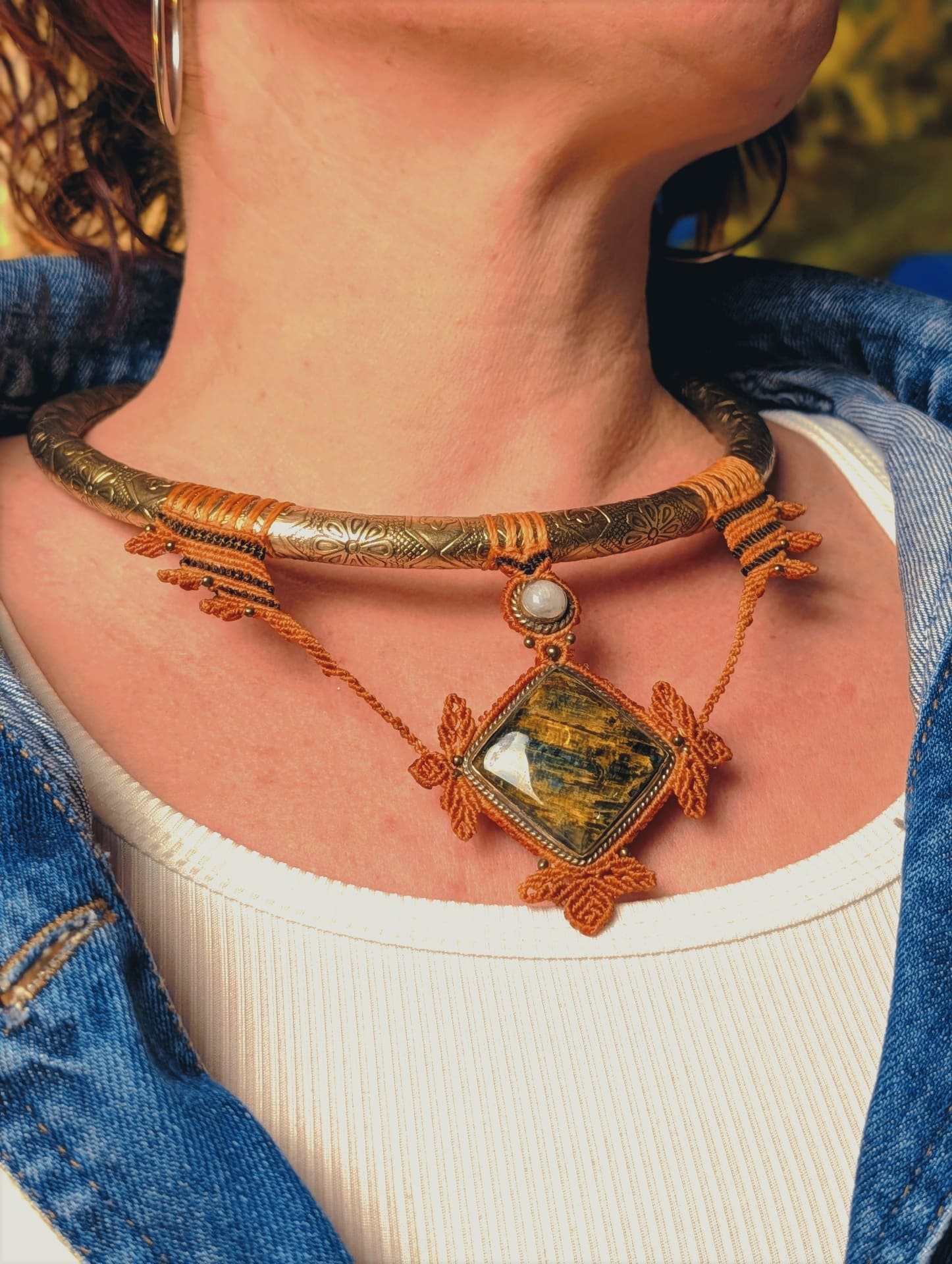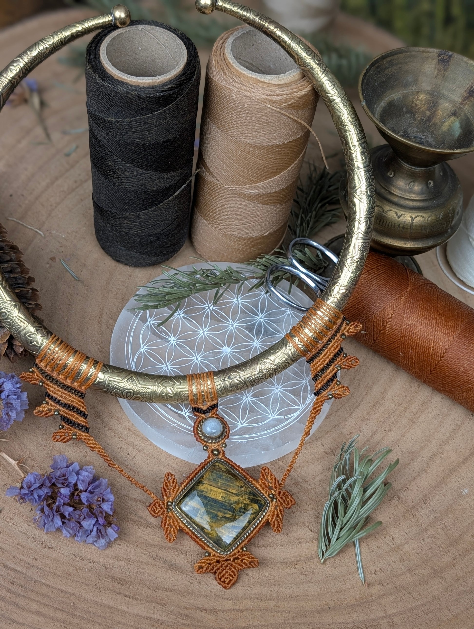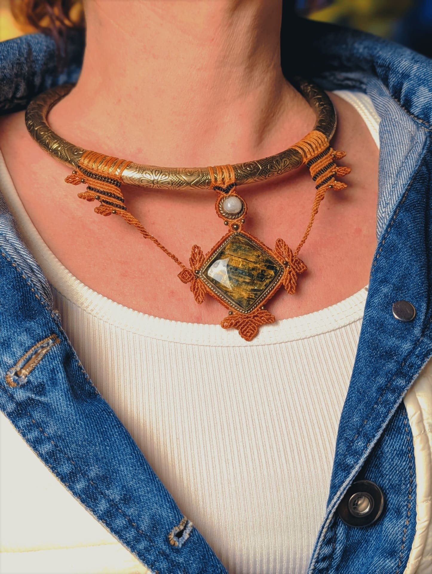 j'ai travaillée autour d'un ras de cou en laiton (donc léger et souple), et d'une pierre naturelle de Mellite pour la plus grande,et pierres de lune pour la petite, elles aussi serties de laiton ouvragé.
