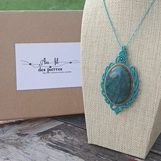 Le pendentif est monté sur un cordon tressé main également, réglable via nœud coulissant à l'arrière, ce qui vous permettra de le porter à la longueur de votre choix, aussi bien en ras de cou sur un décolleté ou bien long en sautoir sur une robe ou un pull.