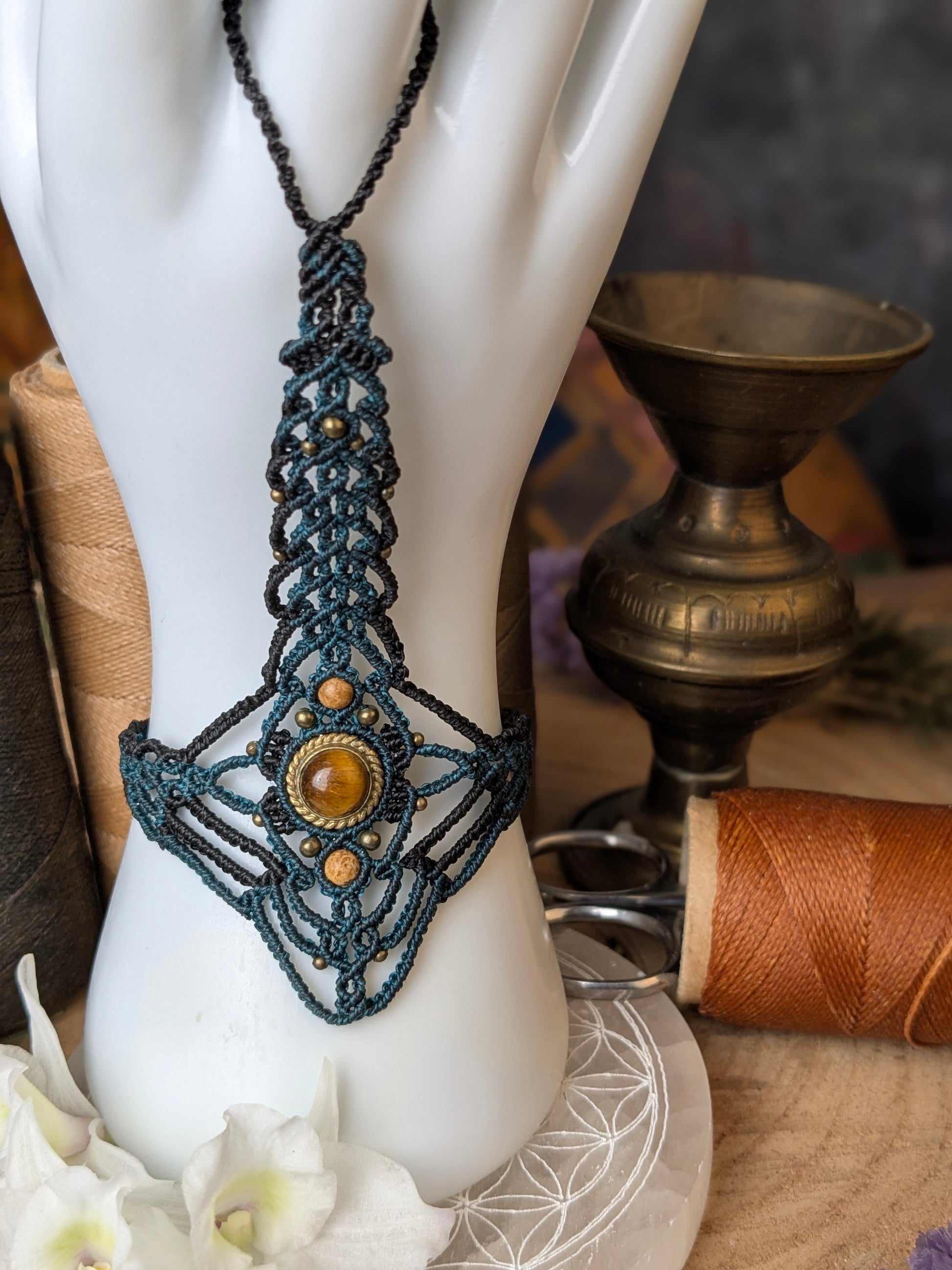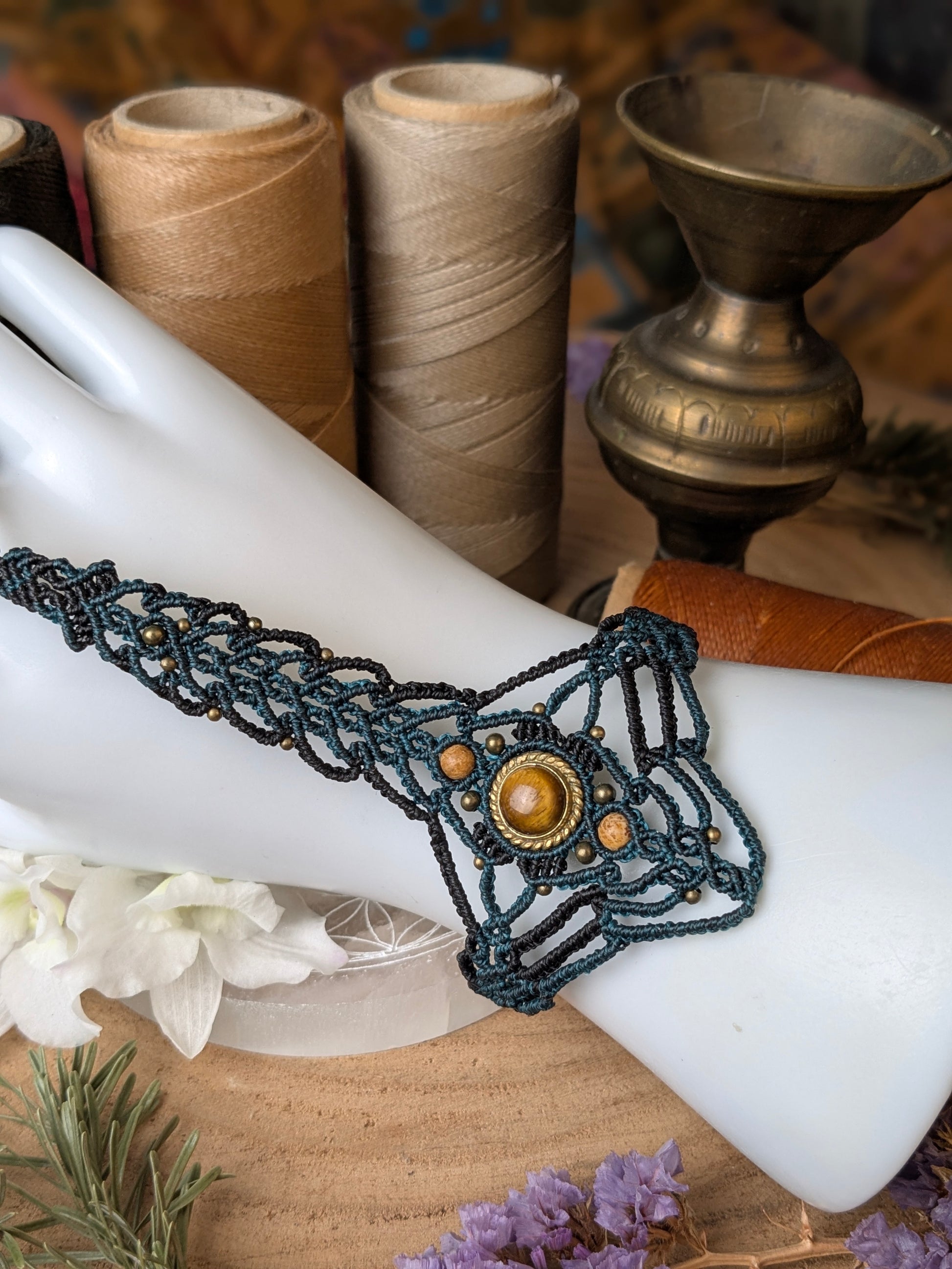 Œil de tigre sertie de laiton ouvragé, et fils très fin pour un bijoux tout en délicatesse et légèreté