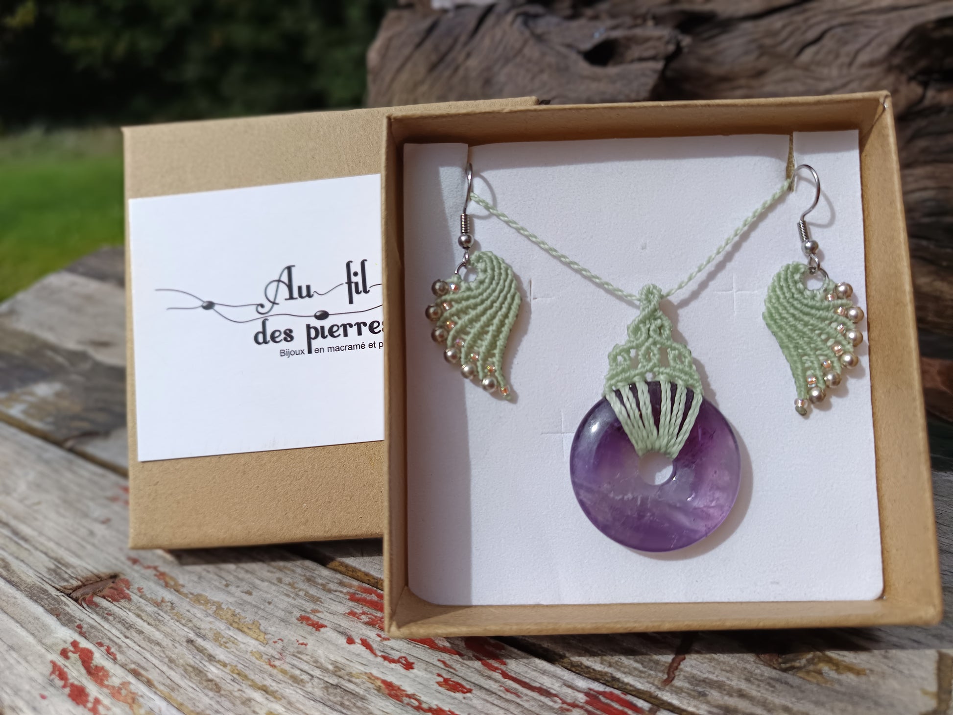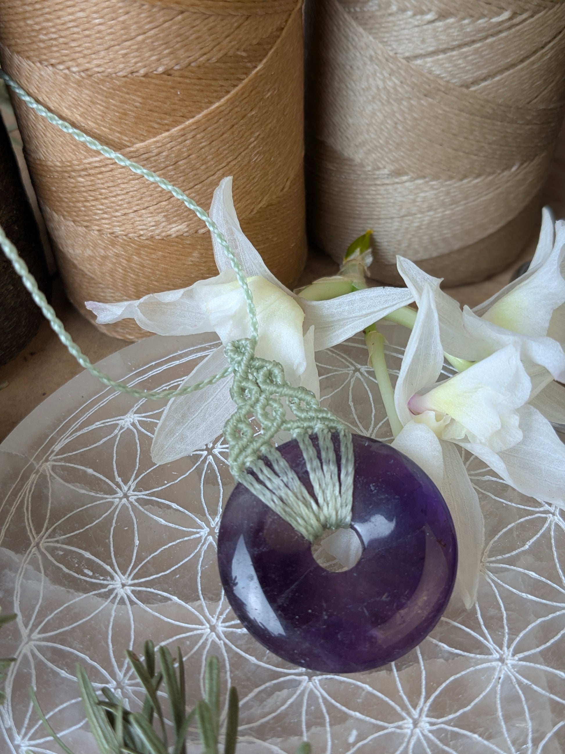 Ce collier est tissé autour d'un donut en Améthyste de 3 cm de diamètre.