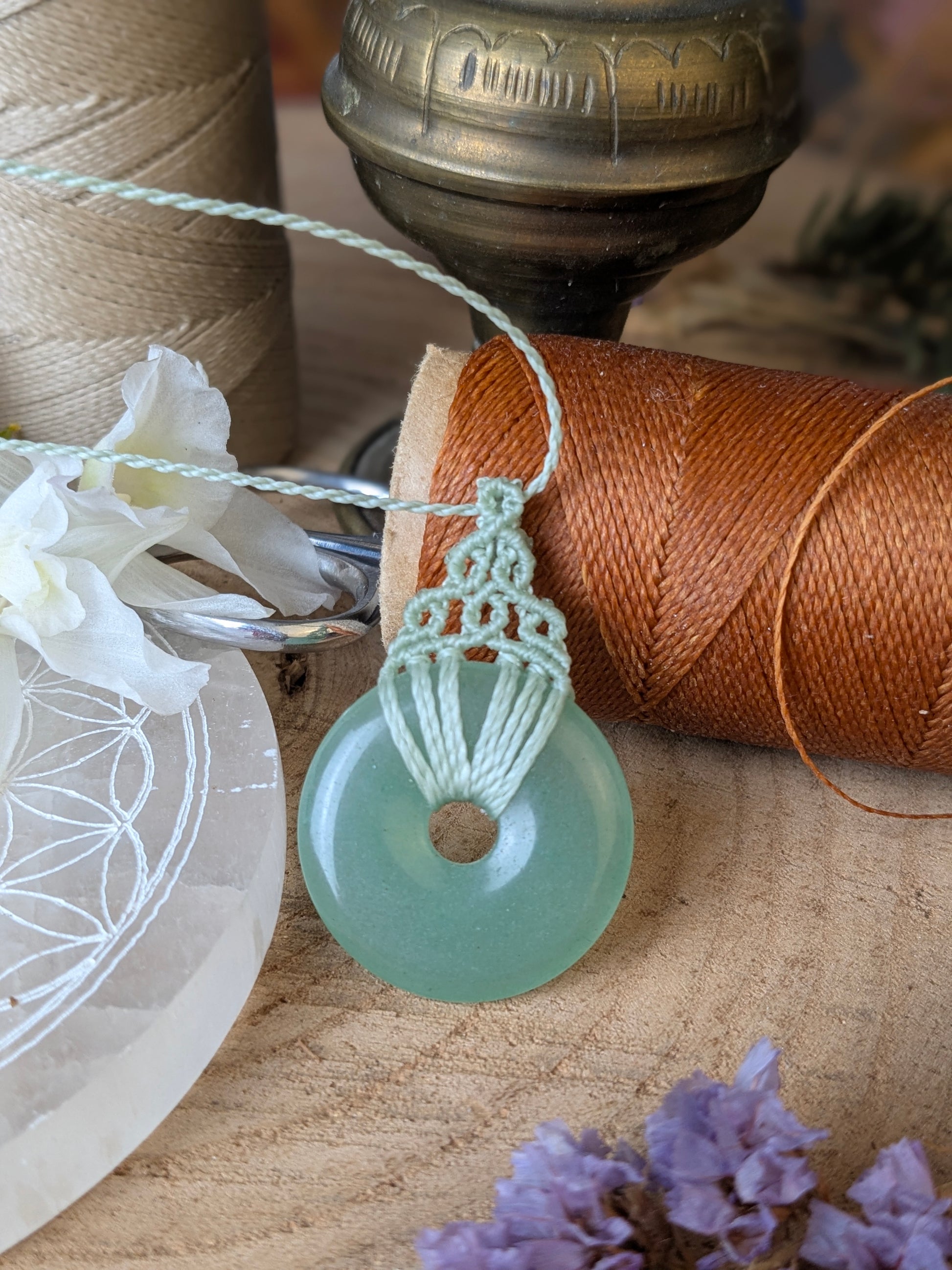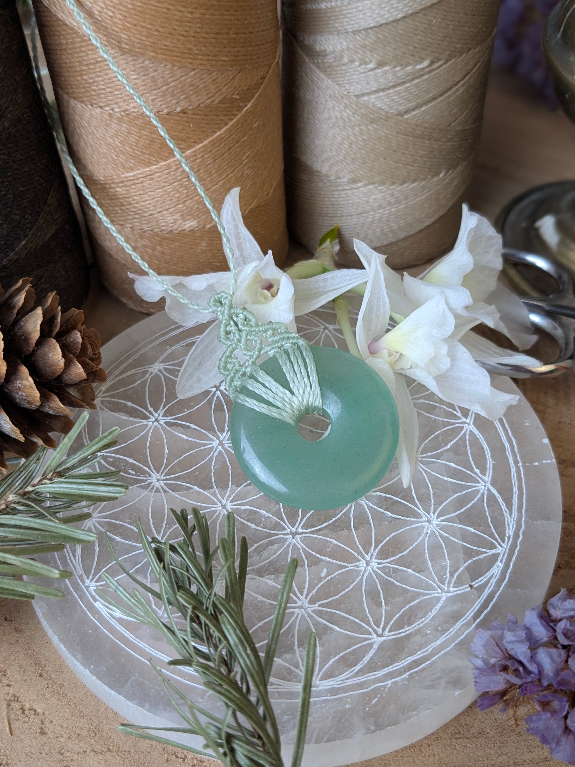 Ce collier est tissé autour d'un donut en Aventurine de 3 cm de diamètre.
