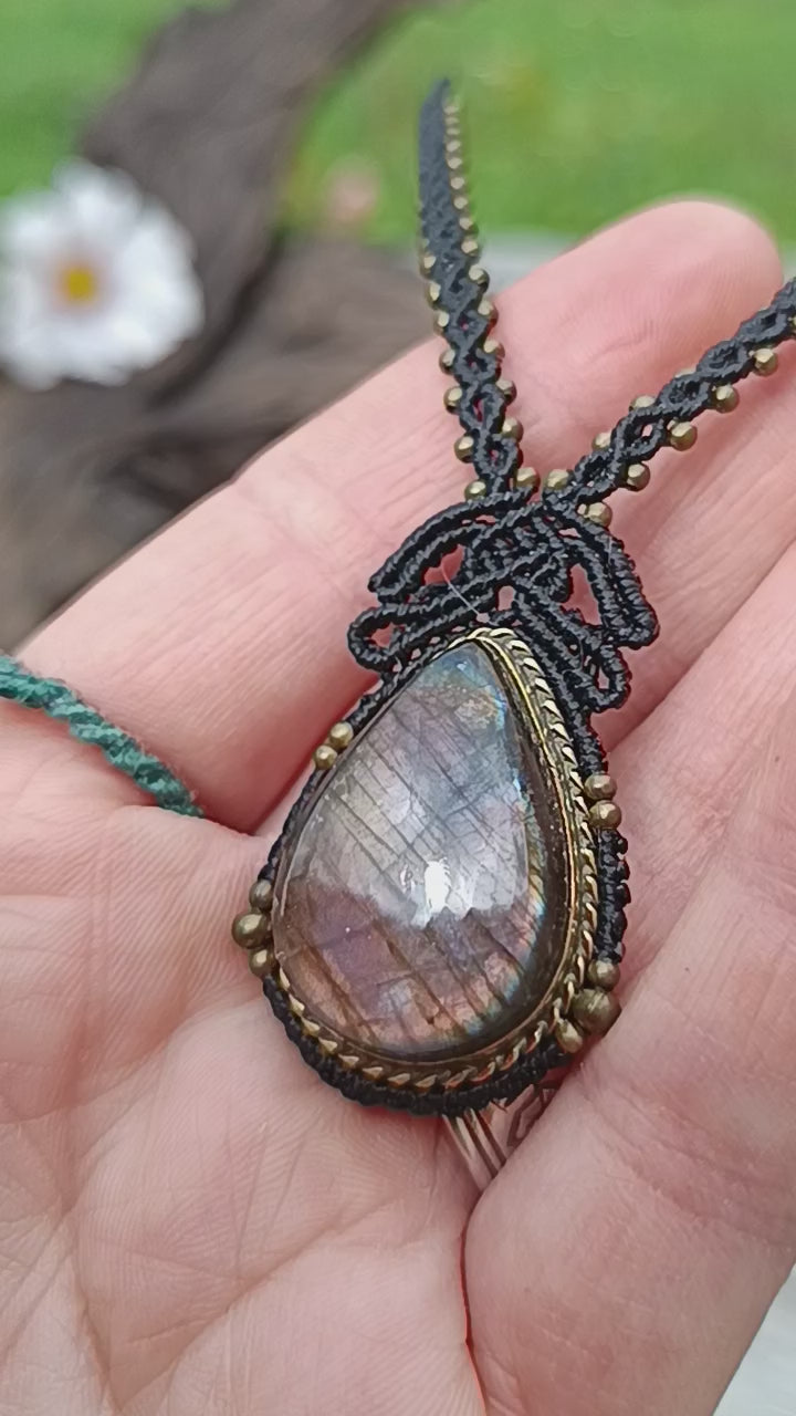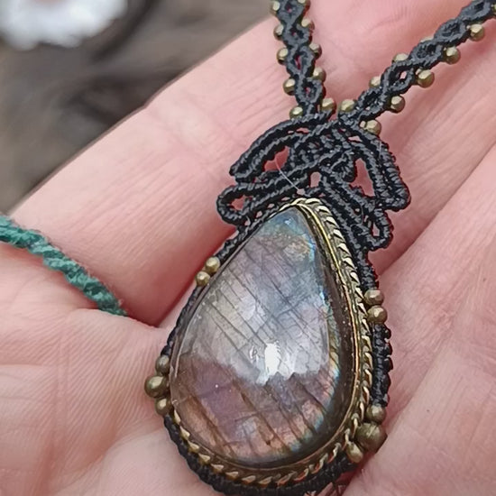 Réalisé autour d'une labradorite sertie de laiton et agrémentée de petites perles en métal bronze, sans plomb, sans nickel, sans cadmium.