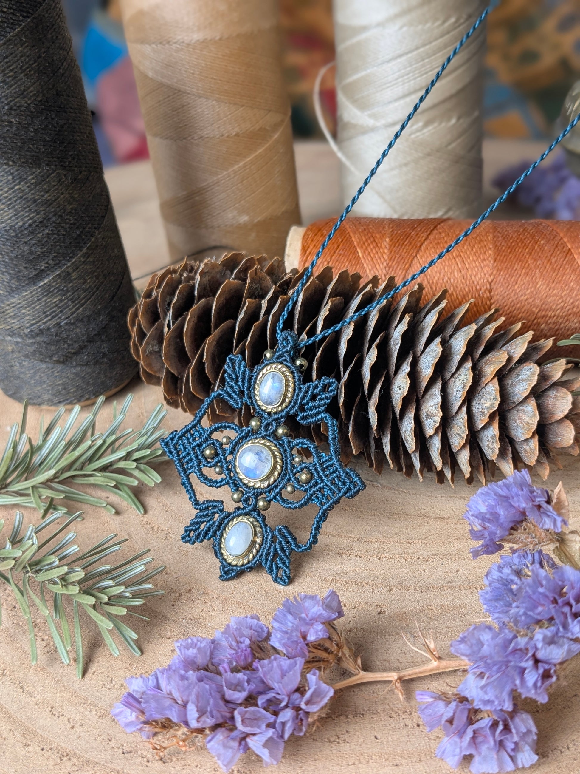 Ce pendentif est tissé autour de 3 pierres naturelles serties de laiton ouvragé, Agrémenté de quelques perles en métal couleur bronze.