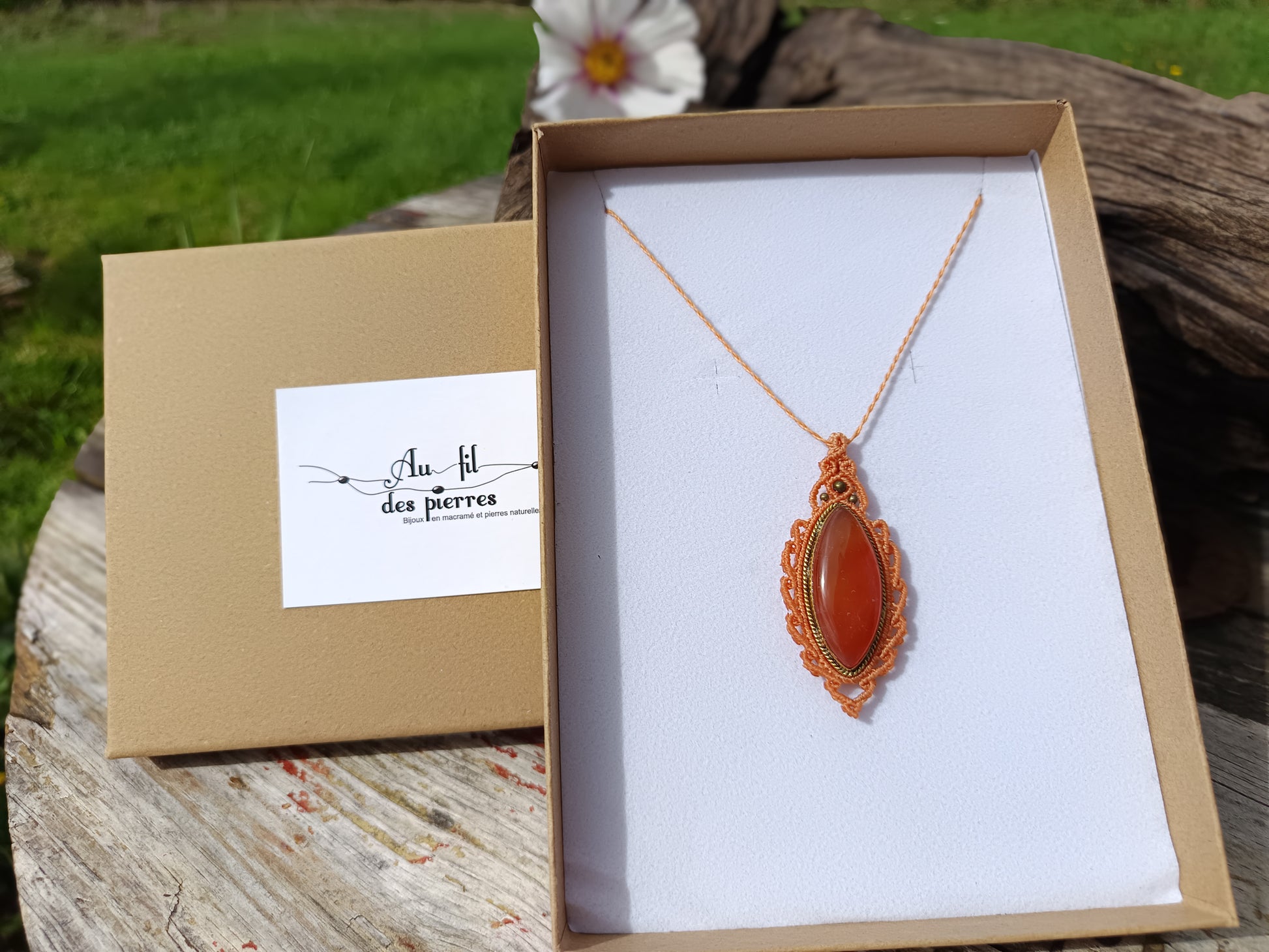 Le pendentif est monté sur un cordon tressé main également, réglable via nœud coulissant à l'arrière, ce qui vous permettra de le porter à la longueur de votre choix, aussi bien en ras de cou sur un décolleté ou bien long en sautoir sur une robe ou un pull.