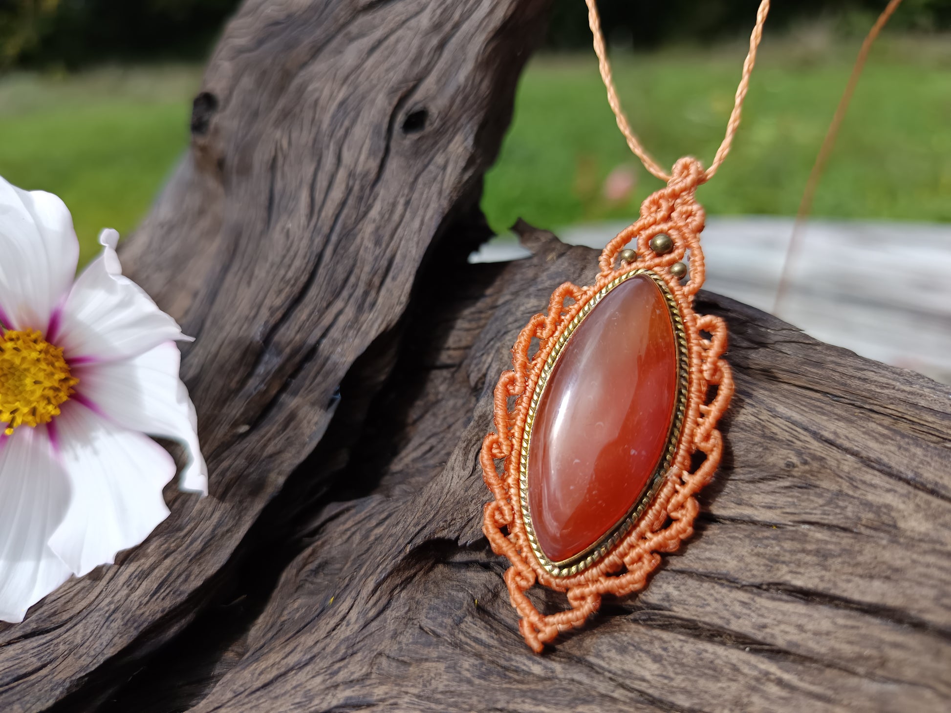 Pendentif réalisé autour d'une pierre naturelle Coraline sertie de laiton ouvragé.