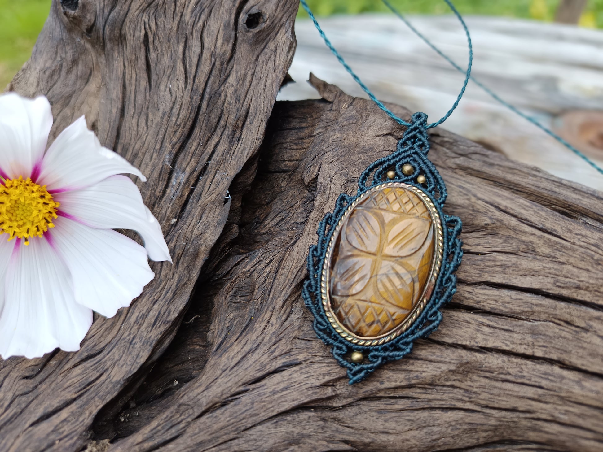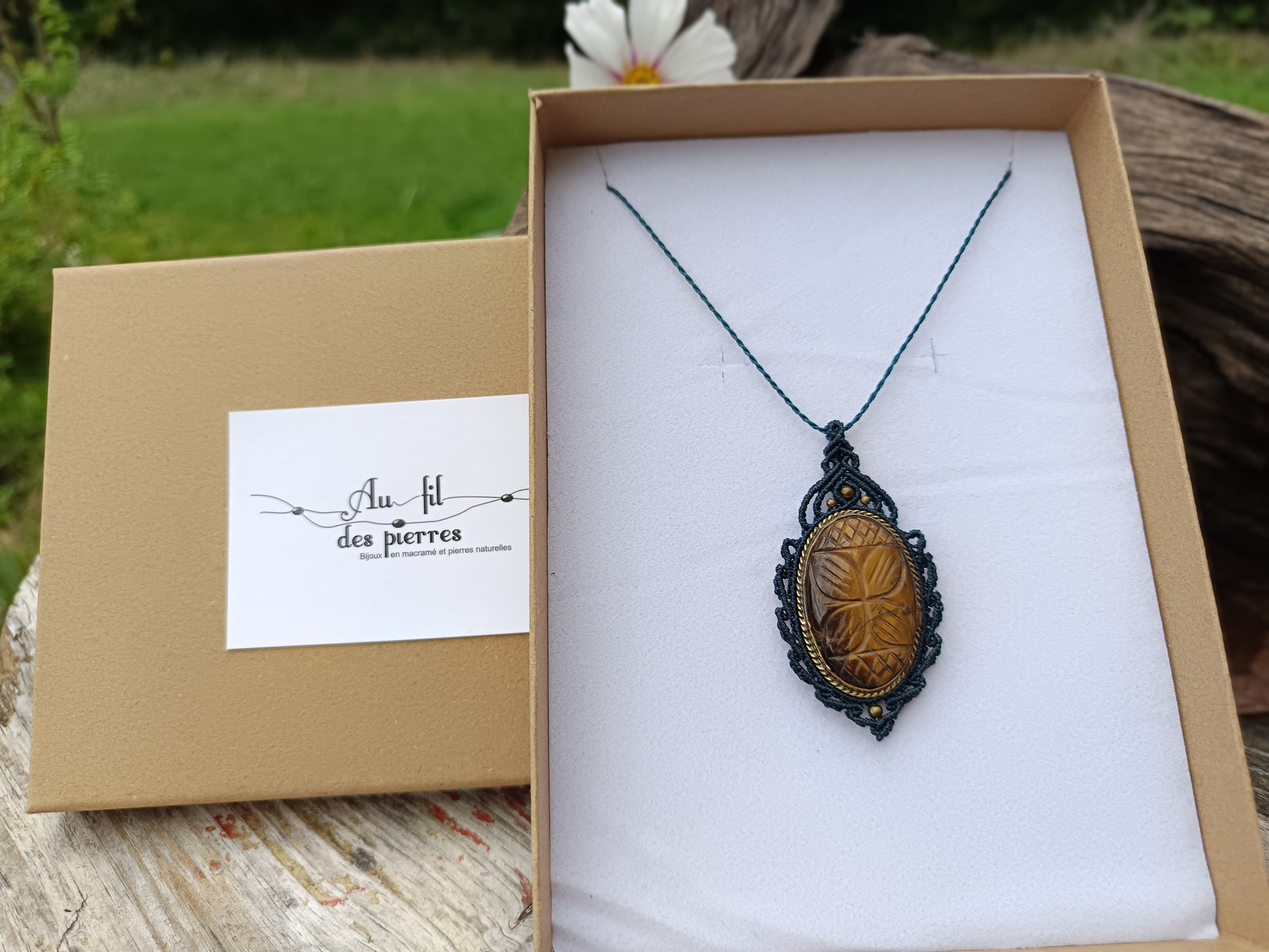Pendentif réalisé autour d'une pierre naturelles d'oeil de tigre gravée et sertie de laiton.