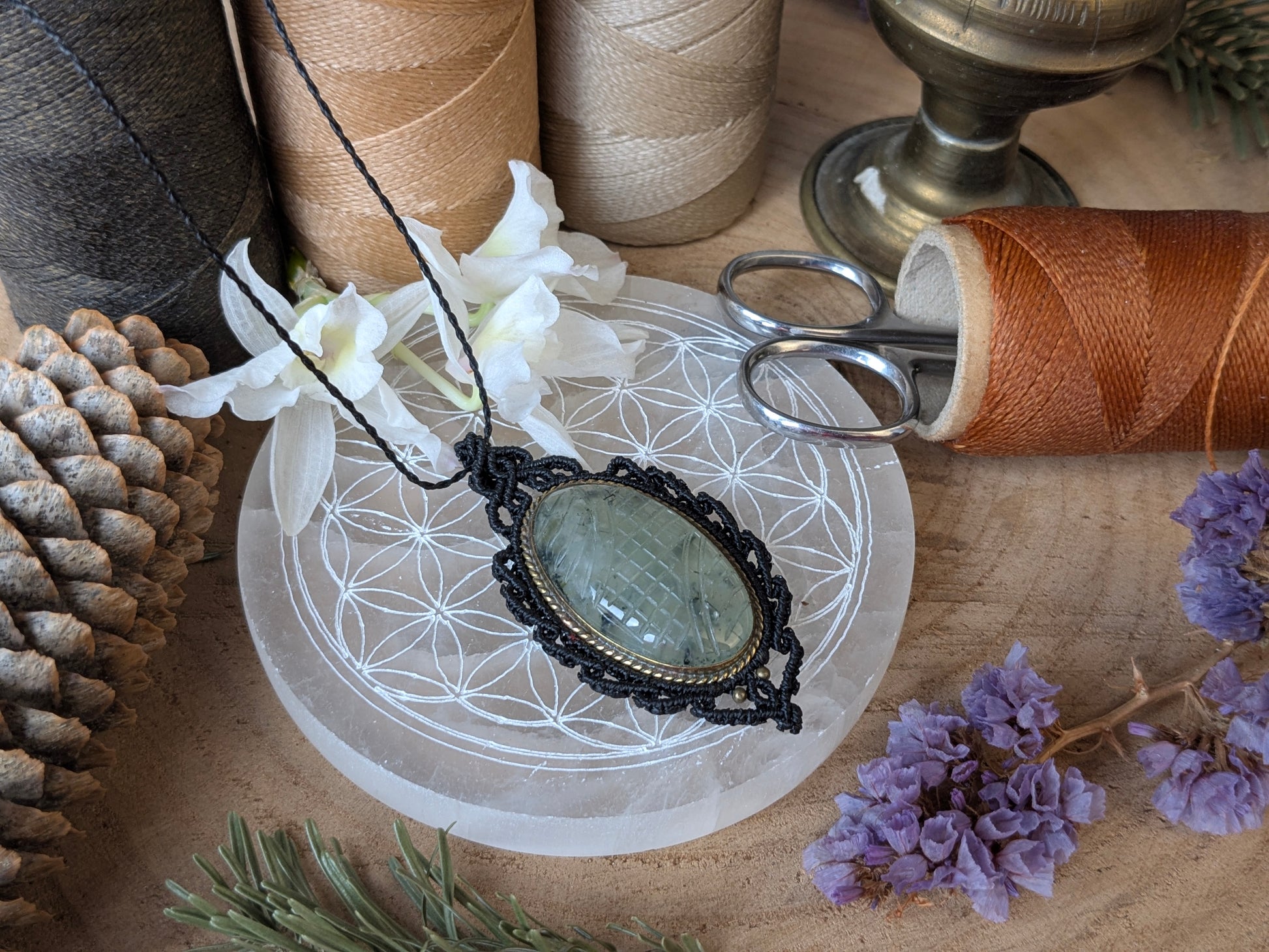 Le pendentif est monté sur un cordon tressé main également, réglable via nœud coulissant à l'arrière, ce qui vous permettra de le porter à la longueur de votre choix, aussi bien en ras de cou sur un décolleté ou bien long en sautoir sur une robe ou un pull.