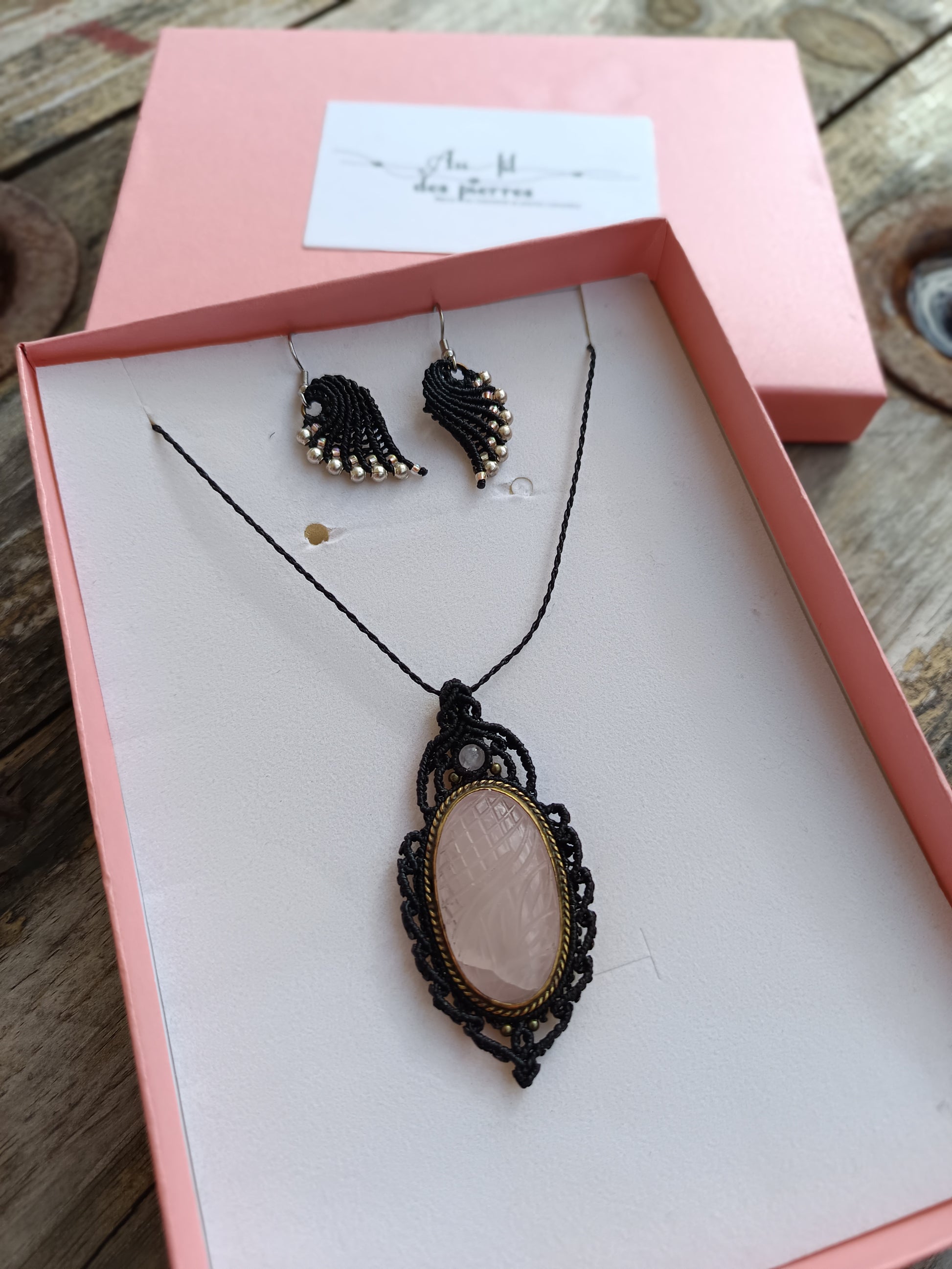 Pendentif réalisé autour d'une pierre naturelles en quartz rose gravée et sertie de laiton.